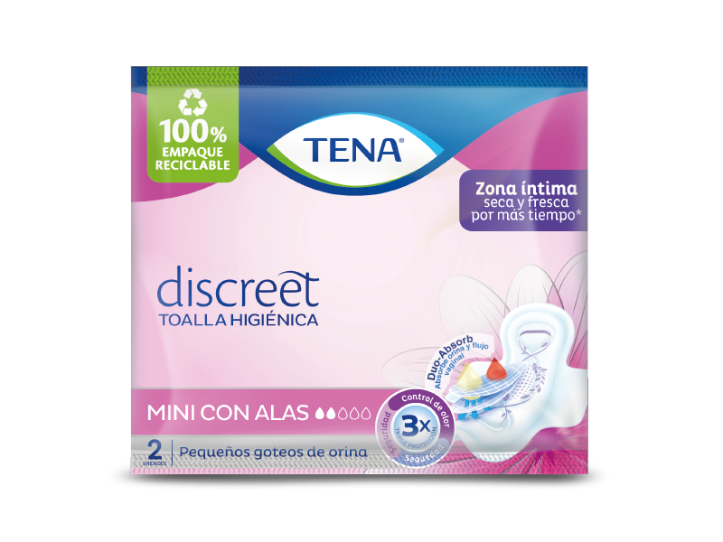 Toalla higiénica con alas para pequeños goteos de orina. Similar en tamaño y forma a una toalla higiénica delgada, especializada para incontinencia, con tecnología que neutraliza el olor y absorbe más rápido que una toalla convencional para una zona íntima más fresca y seca por más tiempo. Con cubierta extra suave con la piel y materiales respirables para más frescura en la zona íntima. Canales que distribuyen rápidamente la orina y el flujo vaginal manteniendo la piel libre de humedad.